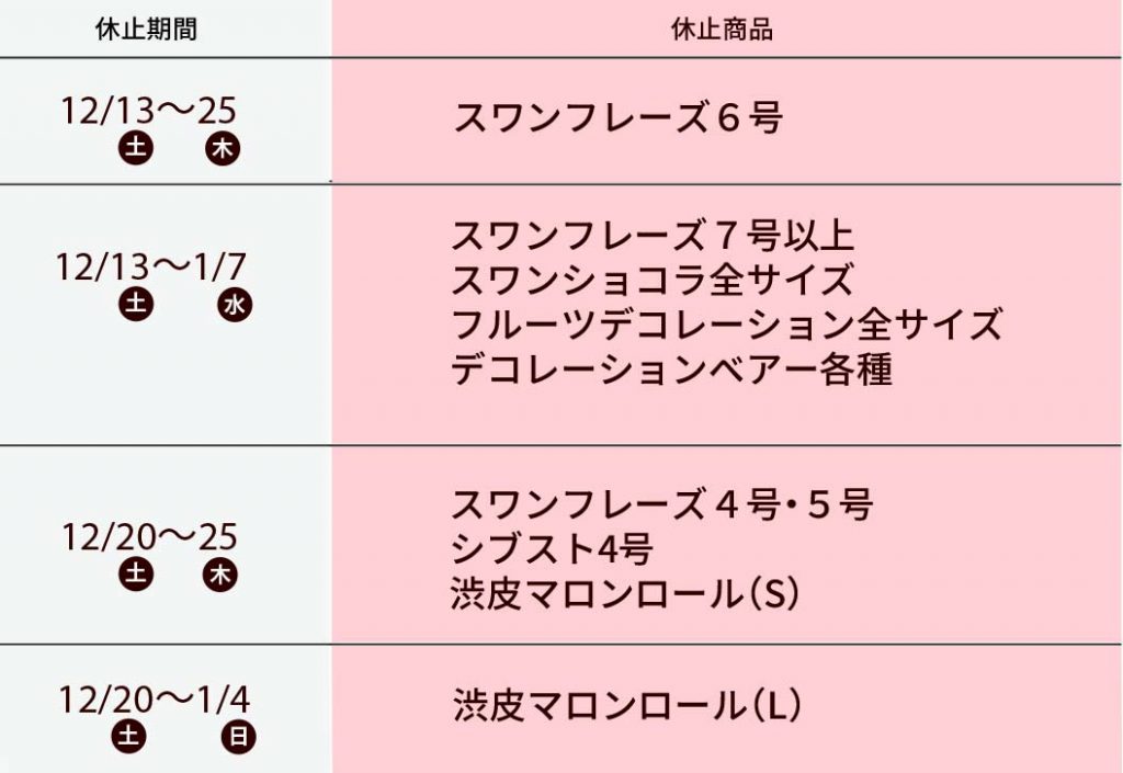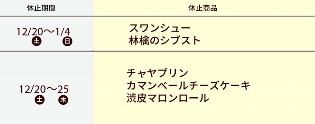 クリスマス・年末年始のケーキの販売とご予約について 2025年12月5日 Tweet 誠に勝手ながら、下記の期間一部ケーキの販売及びご予約を休止致します。【ホールケーキ】 【カットケーキ】 ご迷惑おかけいたしますが、予めご了承賜りますようお願い申し上げます。